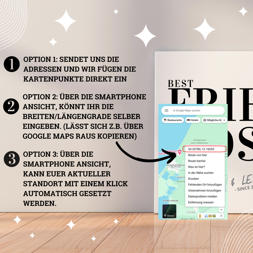 📍[Optional] könnt ihr uns bereits die Adresse oder Längen/Breitengrad + den jeweiligen Namen der jenigen senden, dann trage wir die Orte für euch ein. Ihr erhaltet von uns euren QrCode auf einer seperaten Karte und könnt darüber selber die Orte festlegen und jederzeit ändern.