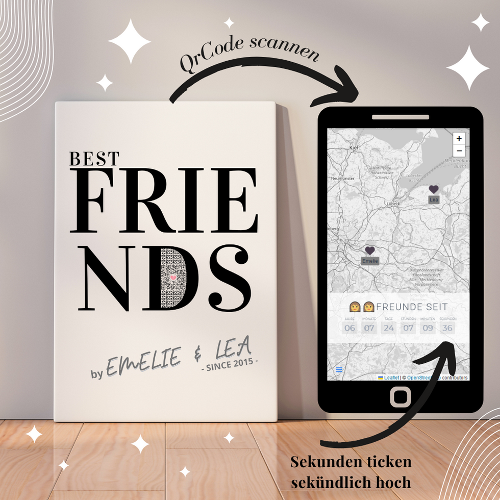 🤳 Auf diesem persönlichen Bild auf Leinwand (20x30cm), ist ein individueller QrCode. Wird der QrCode auf dem Bild gescannt, seht ihr die aktuelle Dauer eurer Freundschaft als Zeitrechner und eure Wohnorte als Herzsymbol auf einer Weltkarte. Das Herz pulsiert schwarz/rot und der Sekunden Zeiger tickt sekündlich hoch.